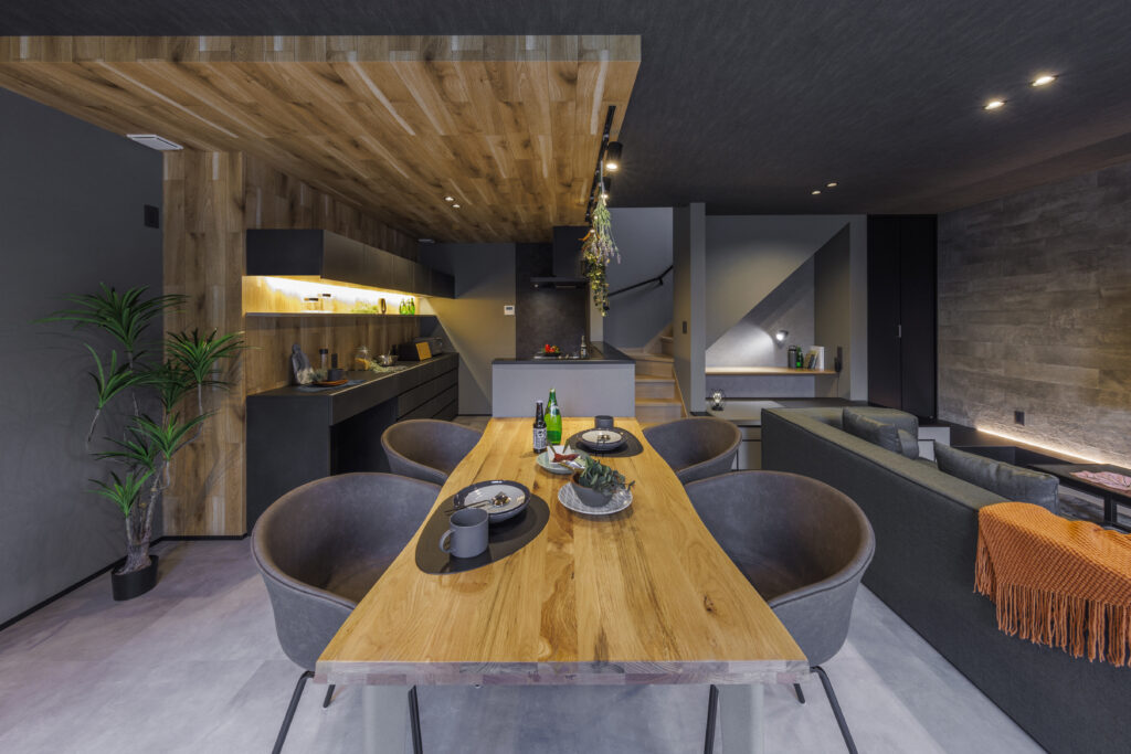 自然光との関係も計算された、照明計画によってリビングはより家族が集う空間に。 グレーのアクセントがより、雰囲気をまとめあげてくれます。 カフェテリアに居るかのような雰囲気を楽しみながら、日常を過ごすことが出来ます。