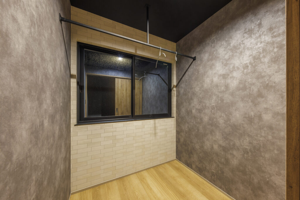 南側の窓からは日差しが差し込み、洗濯物がより乾きやすくなるように単独の空間として計画をしました。アイアンハンガーパイプを使用する事で、空間の雰囲気に溶け込ませることが出来ます。 また、充分なスぺースを確保しているので、洗濯物が多くても困る事はありません。机等を置き、洗濯物を畳んだりアイロン掛けをしていただく事も可能です。